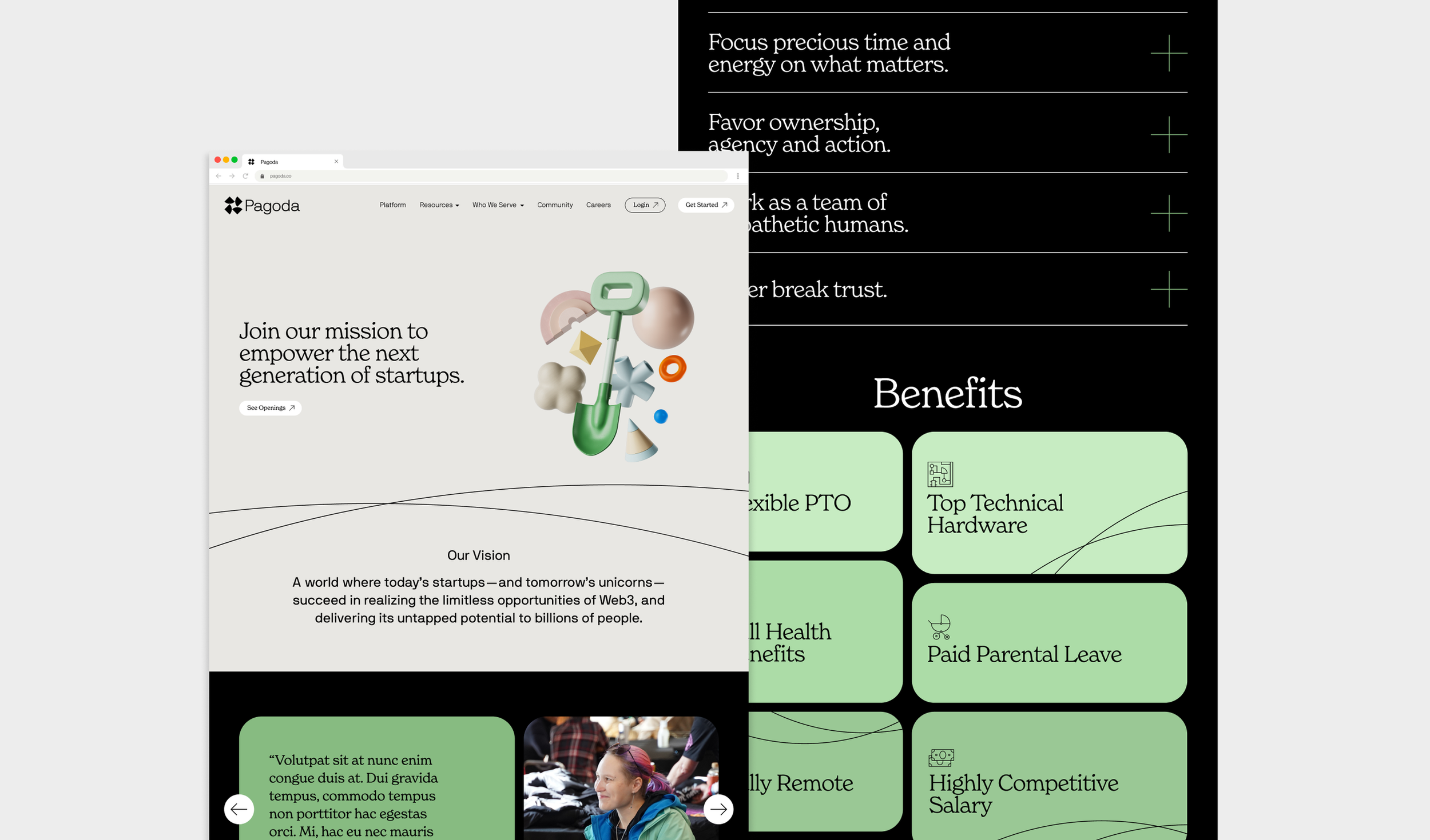 The world's first Web3 app platform. This brand pulls from existing app visual language, but remixes and recontextualizes it as brand elements. The large rounded corner elements stacked on one another, UI elements, and colors all give a sense of a new digital world.